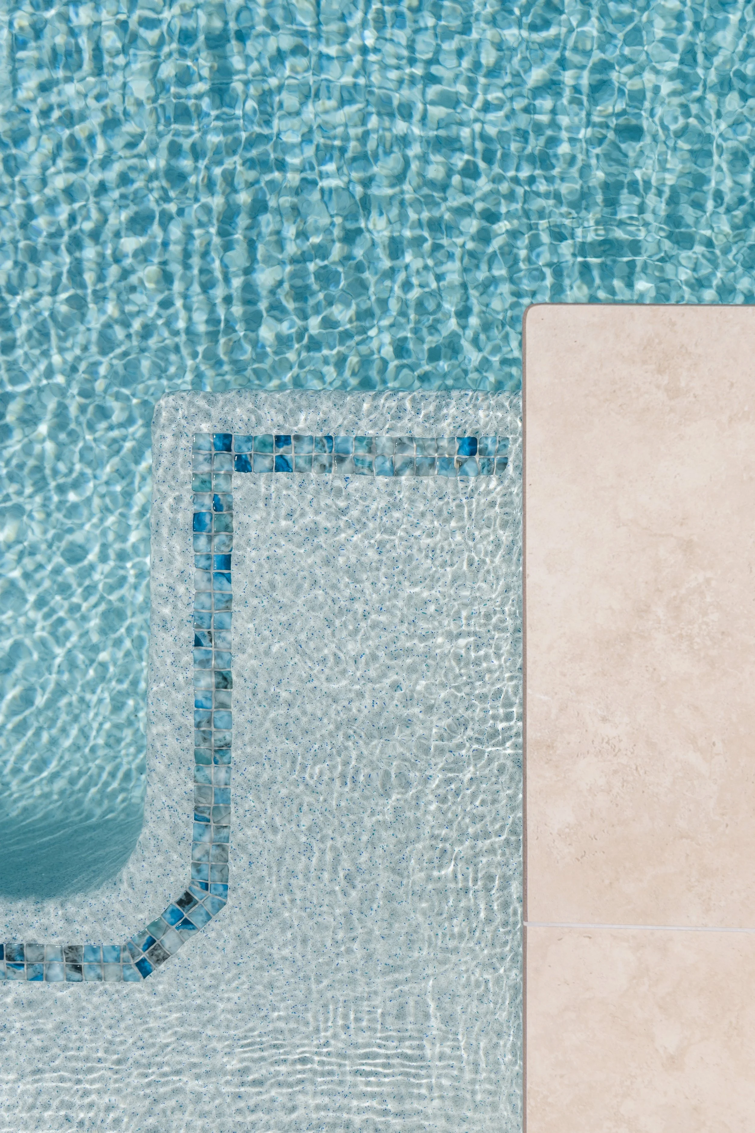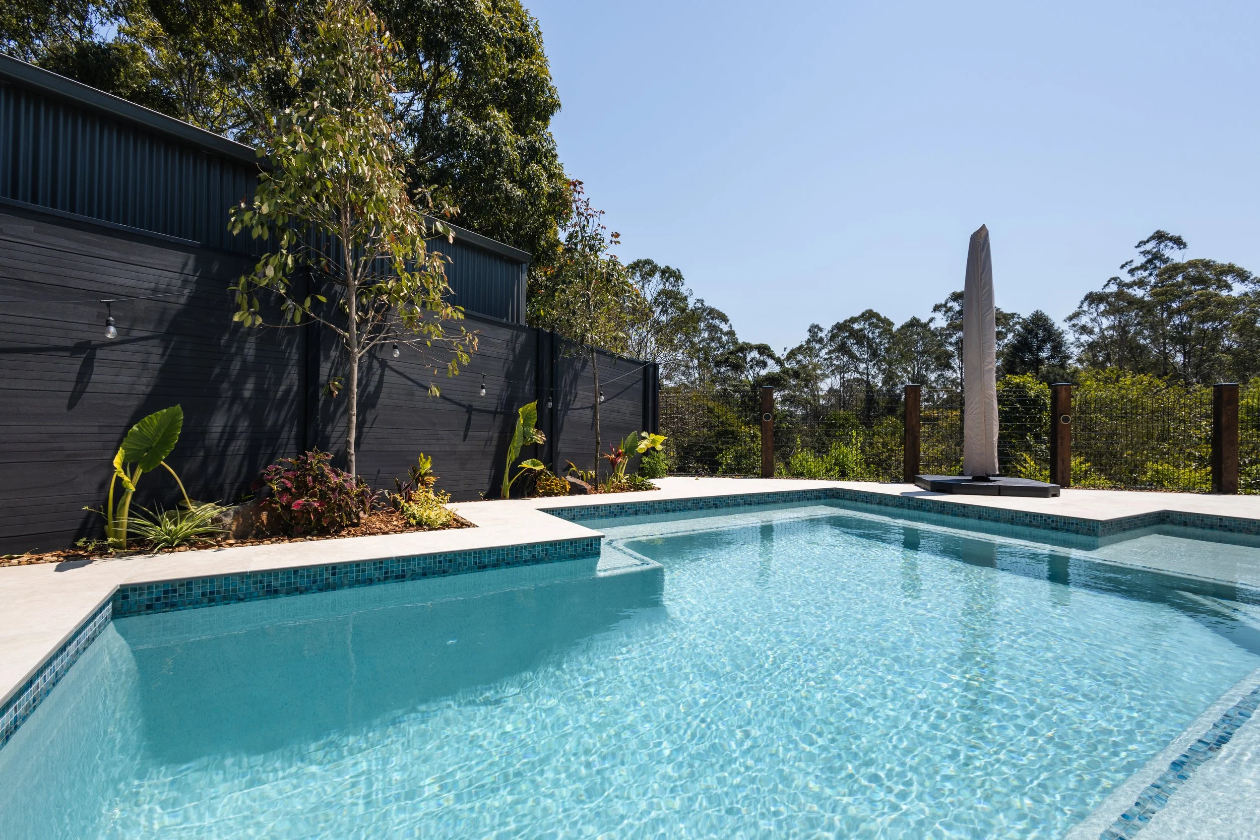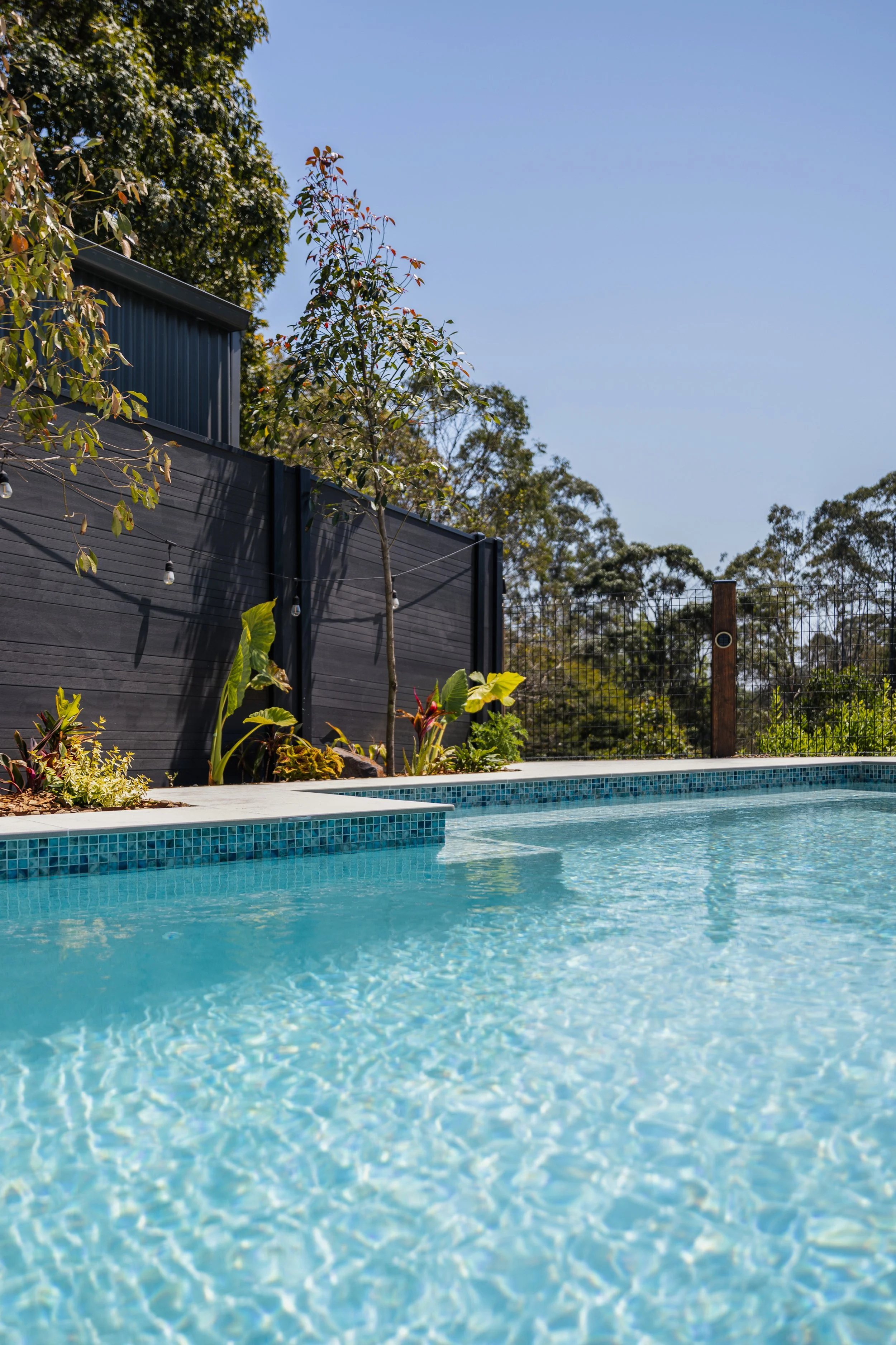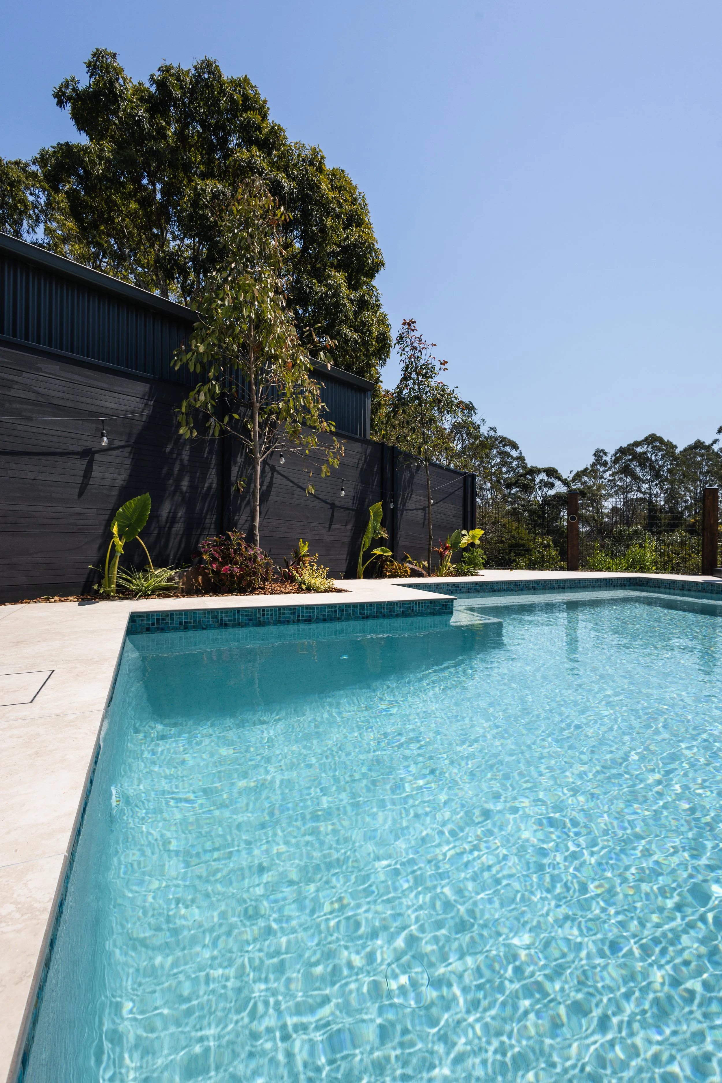 To elevate the finish, porcelain travertine coping and surrounds were selected for their durability, soft tonal variation and timeless appeal. This was paired with a mosaic waterline tile, adding subtle texture and depth without overpowering the overall design. The pool interior is finished in a Sky Blue pebblecrete, chosen to enhance water clarity and deliver a fresh, inviting colour under natural light.